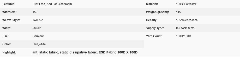- Other ESD Fabric: Antistatic TC and CVC fabric, Antistatic knitted diamond fabric, Antistatic knitted fabric, Antistatic polyester stripe fabric,
