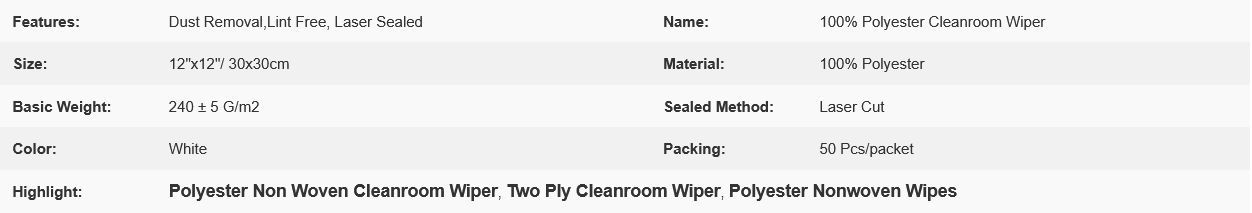 ● Material: The wipes are made from 100% polyester fibers. Polyester is known for its low particle generation, high absorbency, and excellent chemical resistance, making it suitable for cleanroom applications.