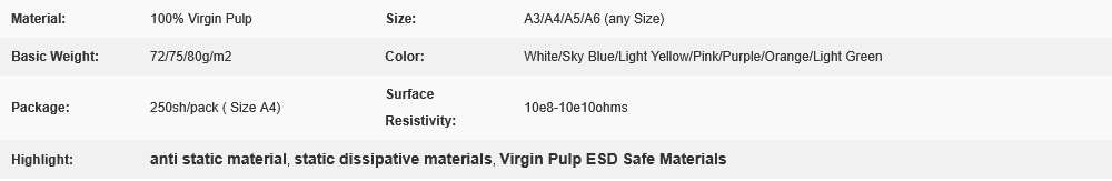 100% Virgin Pulp ESD Safe Paper ESD Safe Materials White Blue Pink Yellow Green