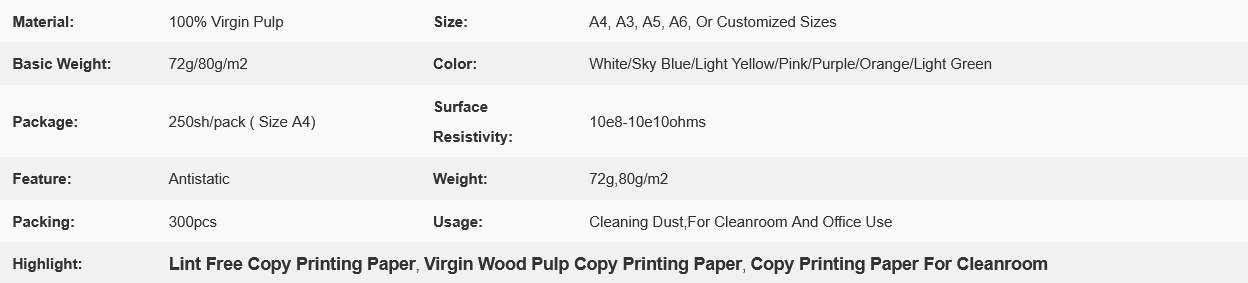 Cleanroom printing papers are mainly designed for writing and printing, by polymerization procese, fibers and particles are tightly bound in a clean paper, and can reduce the static electricity. We offer a viriety of colors and sizes of clean paper. They can be used for notebooks,clean printing paper and writing paper.