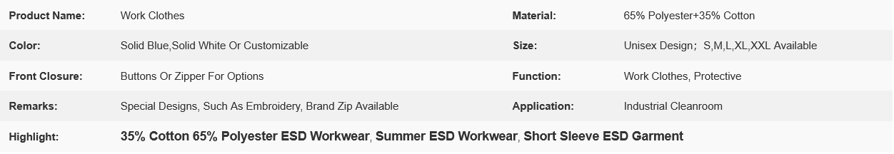 35% Cotton 65% Polyester Short Sleeve ESD Workwear For Summer