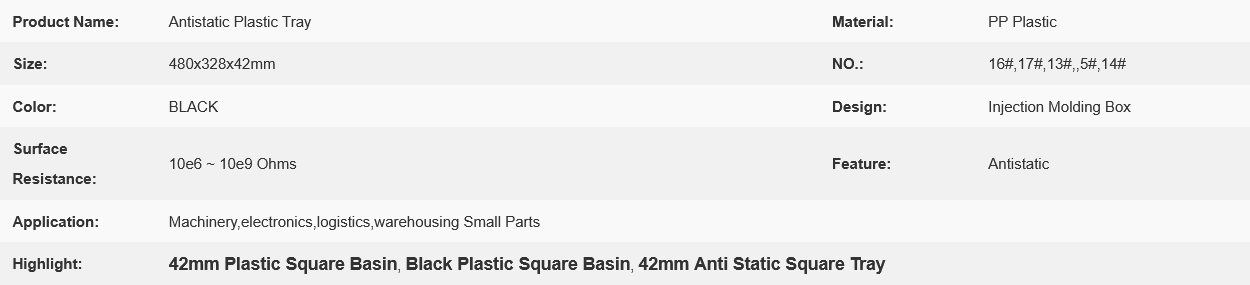 The tray size is 480mm (length) x 328mm (width) x 42mm (height), with a square design and a shallow tray structure, suitable for storing small and medium-sized electronic components, PCB boards, or other electrostatic sensitive materials.