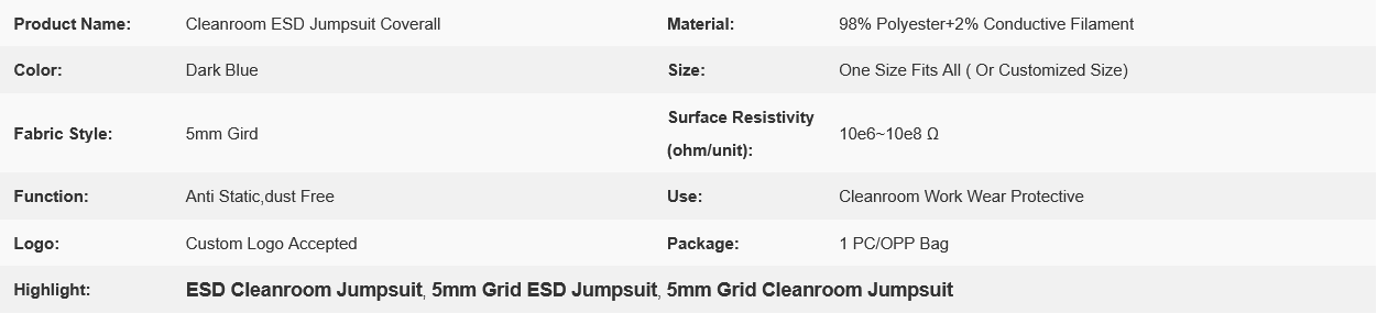 5mm Grid Dark Blue ESD Cleanroom Jumpsuit Coverall For Electronics Industries