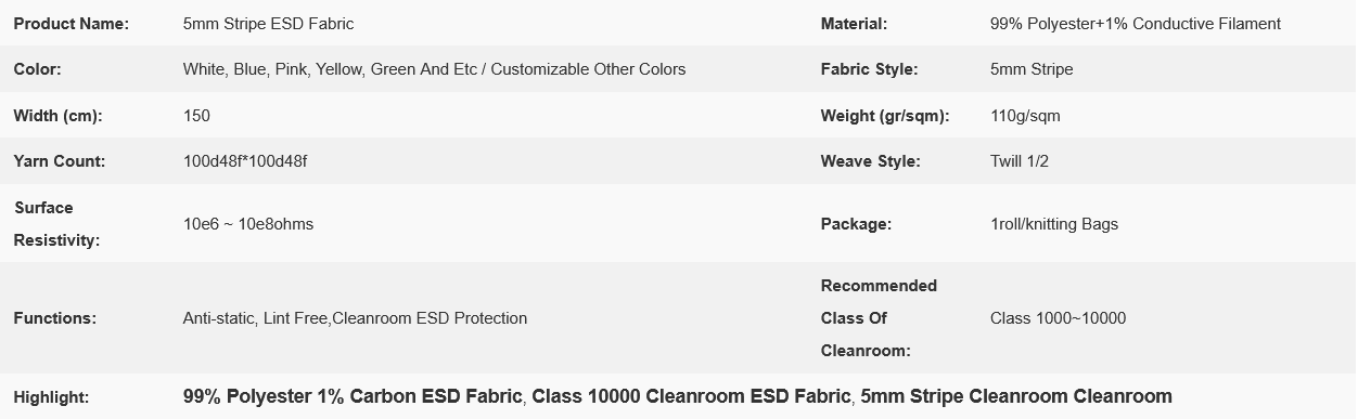 5mm Stripe 99% Polyester 1% Carbon ESD Fabric For Class 10000 Cleanroom