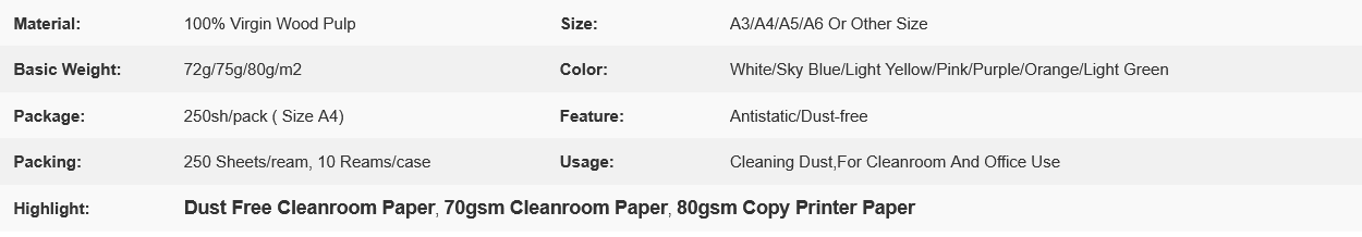 Perfect print A4 paper is designed for writing, printing, and photocopying by polymerization process, fibers and particles are tightly bound in a clean paper and can reduce the static electricity.we offer a variety of colors and sizes of cleanroom paper, they can be used for notebooks, printing paper and writing paper in cleanroom environments.