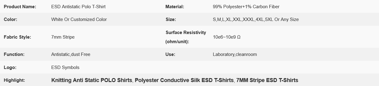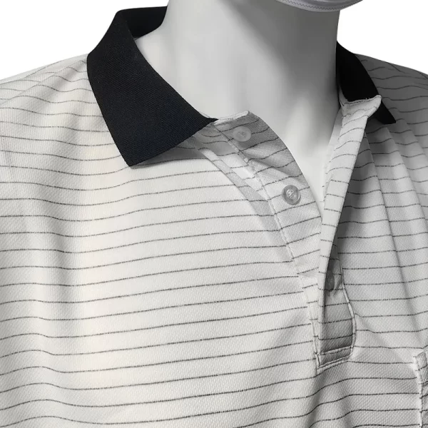 White 7mm stripe 99% polyester + 1% conductive silk anti-static polo shirts are made from a blend of materials that offer both ESD protection and comfort. The fabric composition consists of 99% polyester, providing durability, breathability, and ease of maintenance. Additionally, 1% conductive silk ensures the necessary conductive properties for ESD protection.
