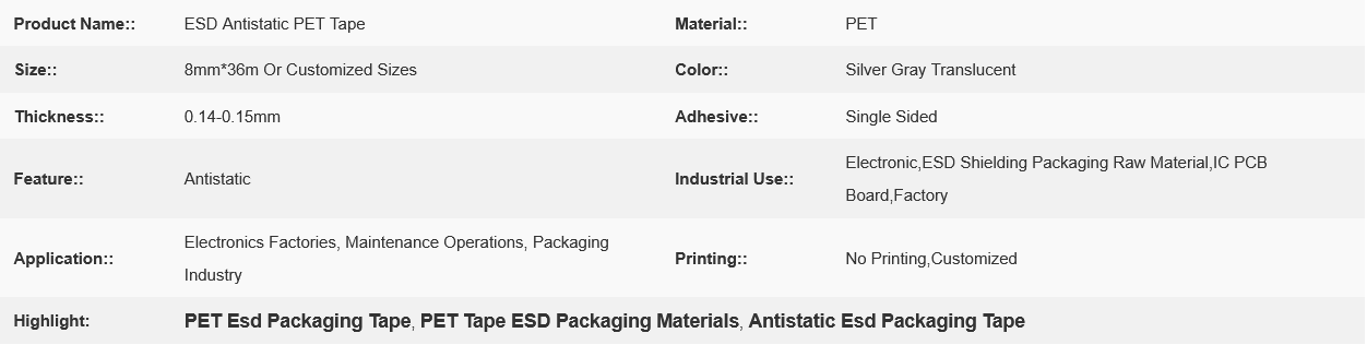 8mm*36m Industry No Printing Silver Gray Translucent ESD Antistatic PET Tape