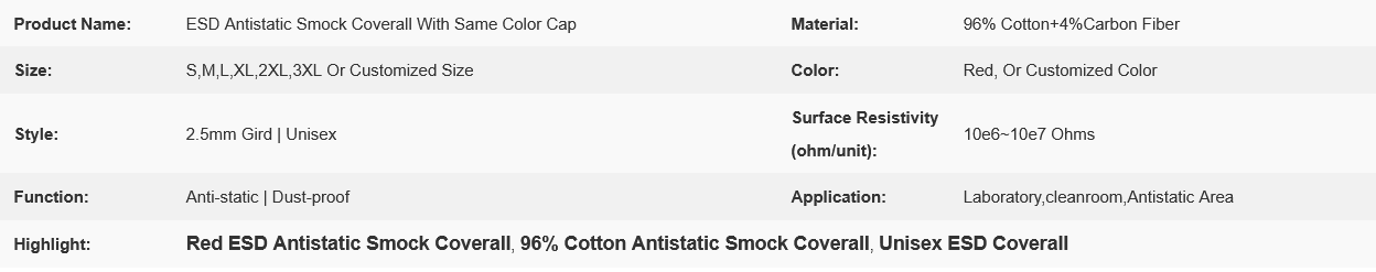 96% Cotton Red ESD Antistatic Smock Coverall with Same Color Cap