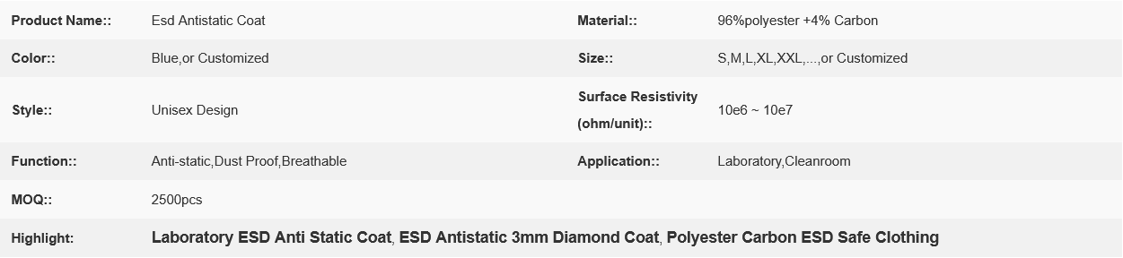 Introducing the ESD Antistatic 96% Polyester 4% Carbon 3mm Diamond Coat, a specialized garment designed to provide electrostatic discharge (ESD) protection and antistatic properties.