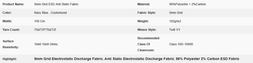 98% Polyester 2% Carbon Anti Static Fiber Plain Grid 5mm ESD Anti-static Cleanroom Fabric