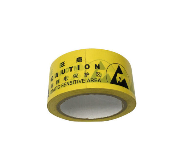 1, Bright yellow vinyl floor tape with bold black ESD symbols and print reading in 2 types, one is ”CAUTION Static Sensitive Area”, another ” ESD Protected Area” for options