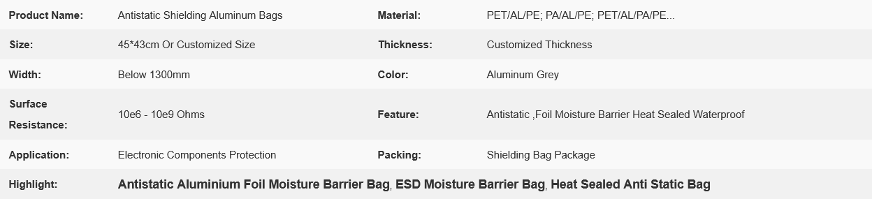 Aluminium Foil ESD Packaging Materials Moisture Barrier Bag Heat Sealed 45*43cm