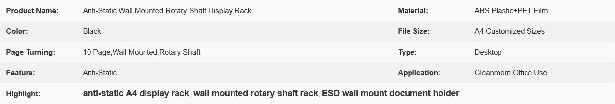 Anti-Static Wall Mounted Rotary Shaft Display Rack is a functional and efficient storage solution designed for organizing and displaying A4-sized ESD (Electrostatic Discharge) folders, files, or documents in workplaces, offices, or industrial settings where static control is essential.
