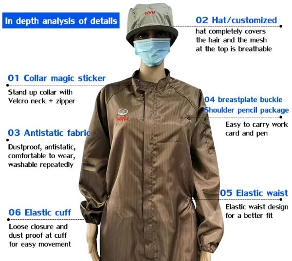 ESD antistatic coveralls are designed to provide full-body coverage and protection. The coveralls typically feature a front zipper closure for easy wearing and removal. They may also include features such as elastic cuffs, ankle cuffs, and a hood for enhanced protection. The design ensures that the wearer is fully covered to prevent static electricity from coming into contact with sensitive equipment or components.