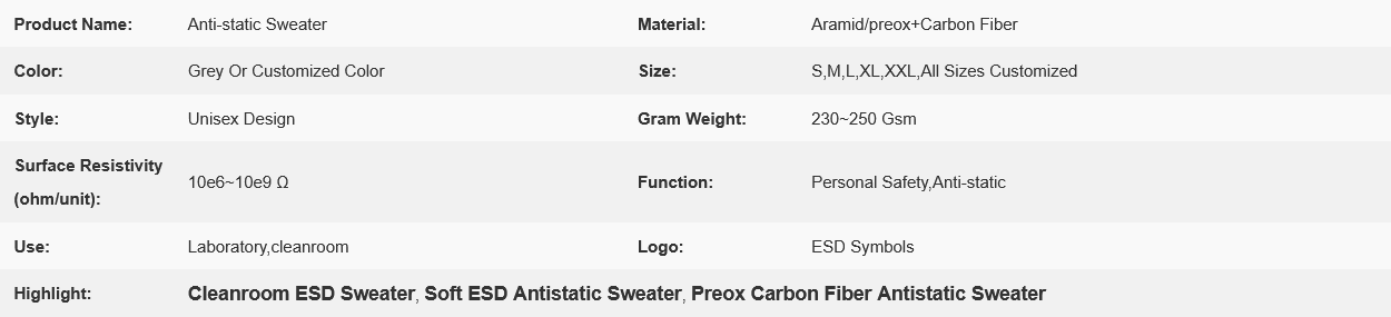 Aramid/Preox+Carbon fiber soft ESD antistatic sweaters are designed to be soft, comfortable, and practical for daily wear in ESD-sensitive environments. The sweaters usually have a pullover or zip-up style with long sleeves and a crew neck or V-neck design. They are constructed to provide a comfortable fit and allow for ease of movement while maintaining the necessary ESD protection.