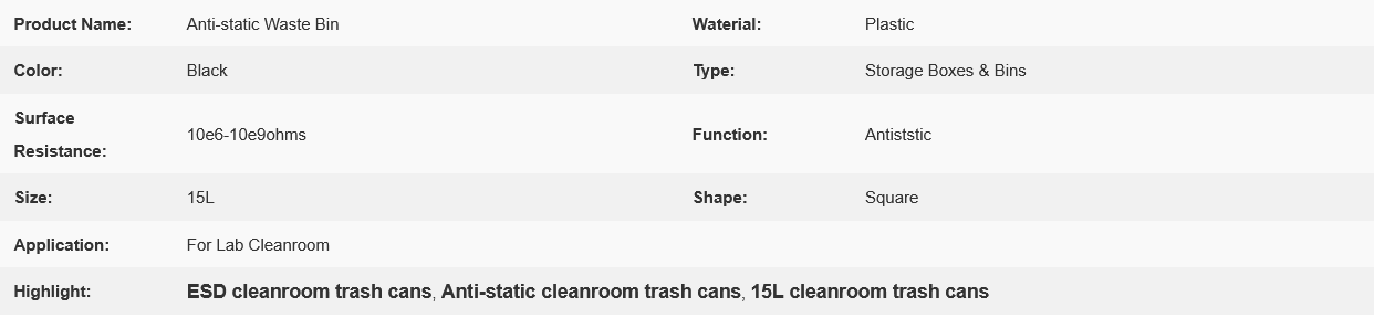 Black ESD Anti-static Plastic Square Dust Free Waste Bin 15L For Cleanroom