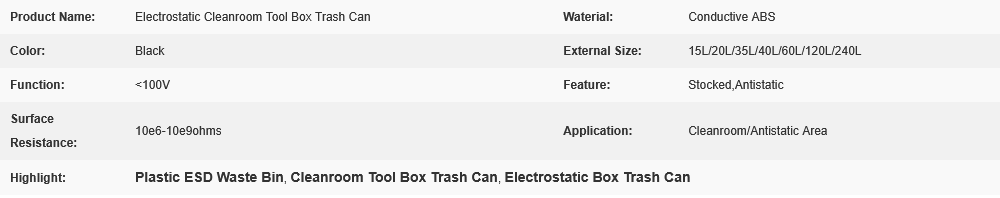 Black Plastic Antistatic Electrostatic Cleanroom Tool Box Trash Can/ESD Waste Bin