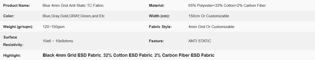 Blue 65% Polyester 32% Cotton 2%Carbon Fiber ESD Fabric Black 4mm Grid Conductive Wire Red Anti Static TC Fabric