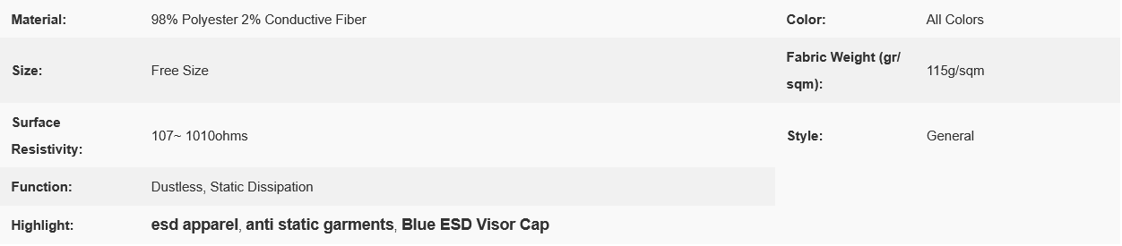 Blue Color Anti Static ESD Visor Cap Elastic Ribbon Around Mesh Open On Top
