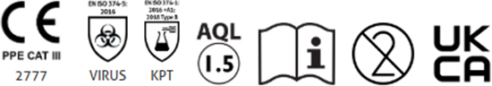 Conforms with the requirements of EN ISO 374-5, for protection against bacteria, fungi and virus