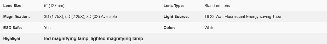 This lamp adopts T9 22 watt fluorescent energy-saving tube that illuminate your project, and the 5 in., 3-Diopter / 5-Diopter lens magnifies 1.75 times / 2.25 times letting you see clearly