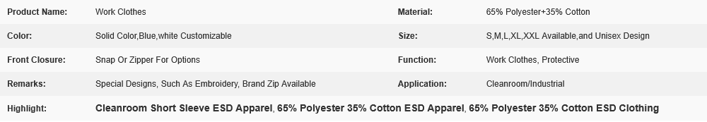 Cleanroom 65% Polyester 35% Cotton Short Sleeve ESD apparel