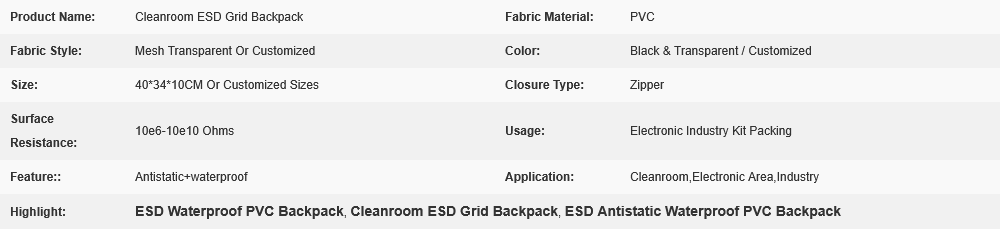 Customized ESD Cleanroom Antistatic PVC Grid Backpack