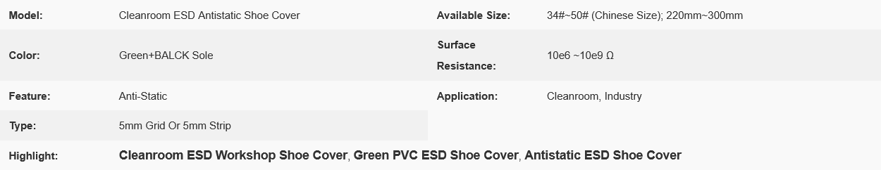 In summary, these are green, anti-static shoe covers with a PVC sole and elastic opening, designed for cleanroom environments to prevent contamination and static discharge. Let me know if you need further details!