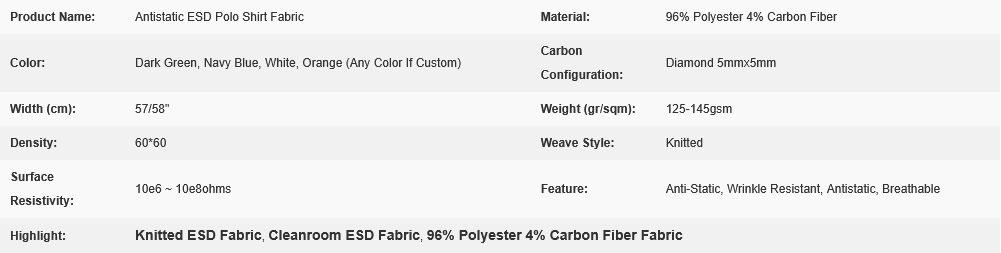 Easy Wash & Dry ESD Polyester Cleanroom Antistatic Knitted 96% Polyester 4% Carbon Fiber ESD Polo Shirt Fabric