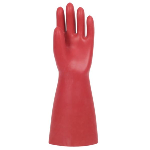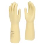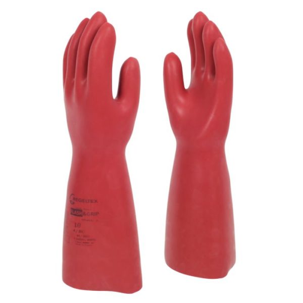 Class 4 electrical insulating natural rubber latex gauntlet, 41cm with cut edges. These gloves provide three-in-one protection, combining dielectric, mechanical and thermal (arc flash) resistance. The specifically formulated outer coating provides exceptional grip, even in humid or greasy conditions.