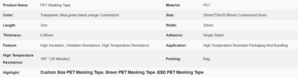 Custom Size Blue Green PET Masking Tape High Temperature Resistant