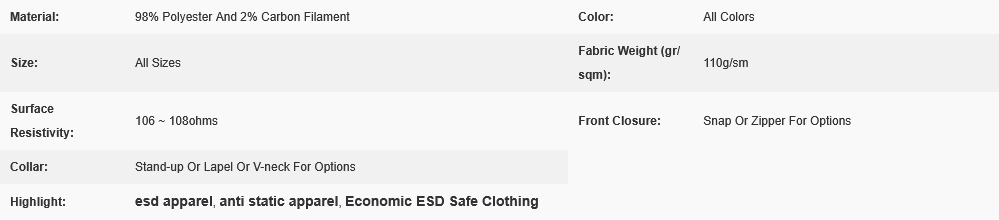 3) There’re two lengths, the lab coat length and the jacket length. It offers good resistance to static, chemicals and abrasion. It is designed for Class 1000-10000 cleanrooms and higher. And it is applicable in Semiconductor assembling line, Laboratory, PCB products and etc.