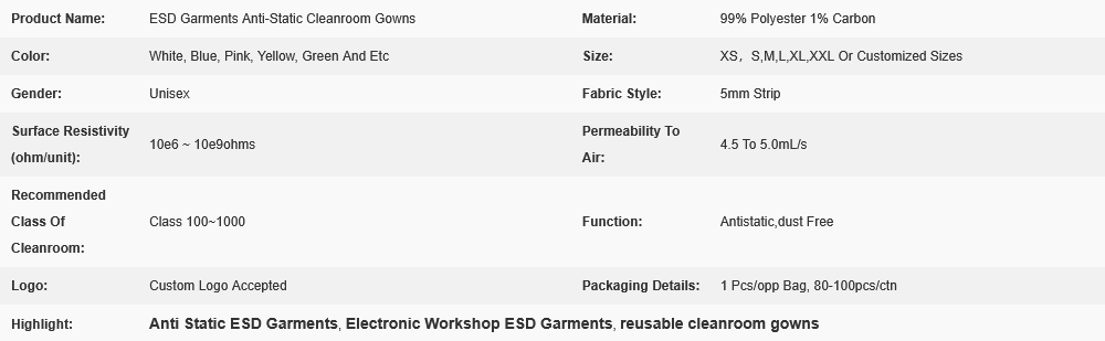 ESD Garments Anti-Static Cleanroom Gowns Description: