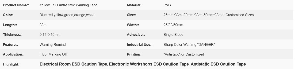Specially designed warning tape for environments such as electronic workshops and electrical rooms, with anti-static (ESD) function.