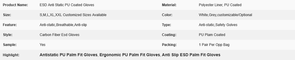 ESD Anti-static PU Palm Fit Glove Descriptions:
