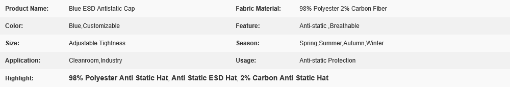 ESD Anti Static Hat Blue 98% Polyester 2% Carbon Fiber For Cleanroom