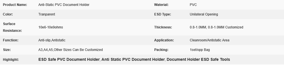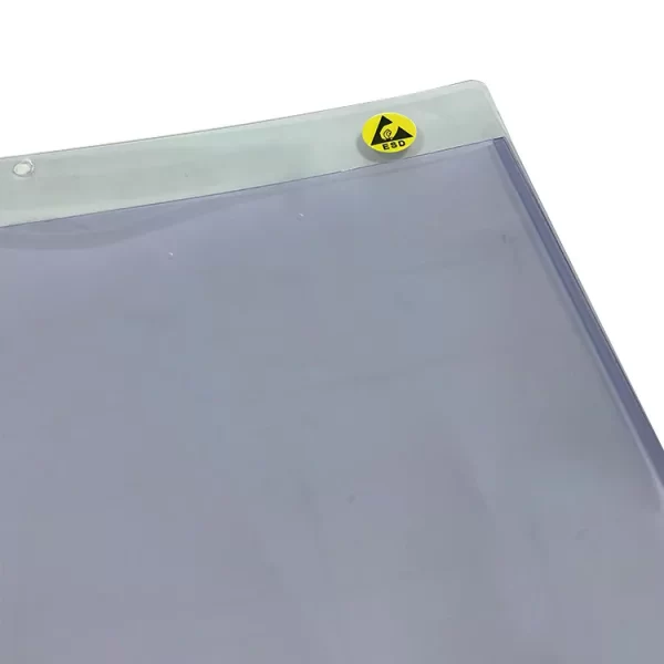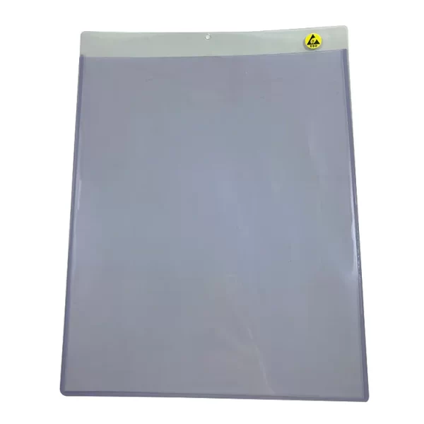 Anti-static folder, also known as anti-static transparent folder, anti-static hard rubber sleeve, ESD card sleeve, work instruction sleeve, material status card bag, surface resistance value 10 ^ 5 Ω – 10 ^ 9 Ω, static discharge time<0.5 s