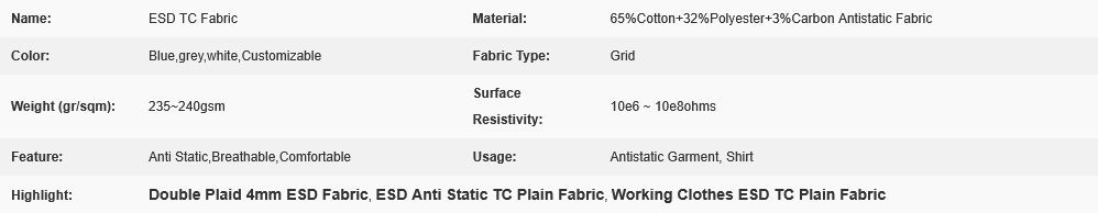 ESD Anti Static TC Plain Fabric with 65% Polyester 33% Cotton2% Carbon Double Plaid 4mm for Working Clothes