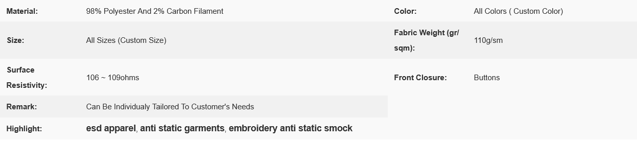 Description: It is made of ESD-safe materials. This fabric could be Polyester / Cotton / TC / CVC material with carbon filament. It does not come from a spray-on application.