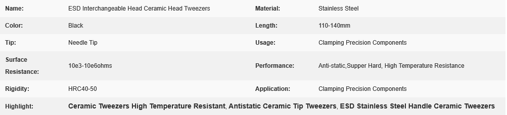 ESD Antistatic High Temperature Resistant and Interchangeable Head Ceramic Head Tweezers with Stainless Steel Handle are essential tools for professionals working in industries such as electronics manufacturing, semiconductor assembly, and precision engineering. They provide antistatic protection, high-temperature resistance, and the ability to handle delicate components with precision and control.