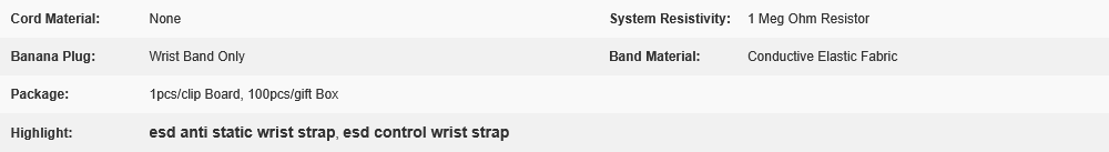 – ESD Fabric Wrist Bands feature silver-plated nylon thread for conductivity.
