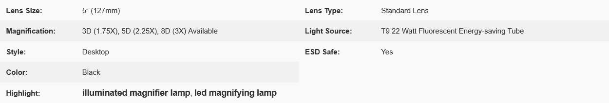Its plastic parts are constructed of antistatic materials, it adopts T9 22 watt fluorescent energy-saving tube that illuminate your project with bright light, and the 5 in., 3-Diopter / 5-Diopter / 8-Diopter lens magnifies 1.75 times / 2.25 times / 3 times letting you see every detail.
