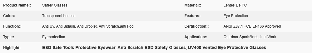 ESD Safety Clear Eye Protective Glasses Anti Scratch UV400 Vented