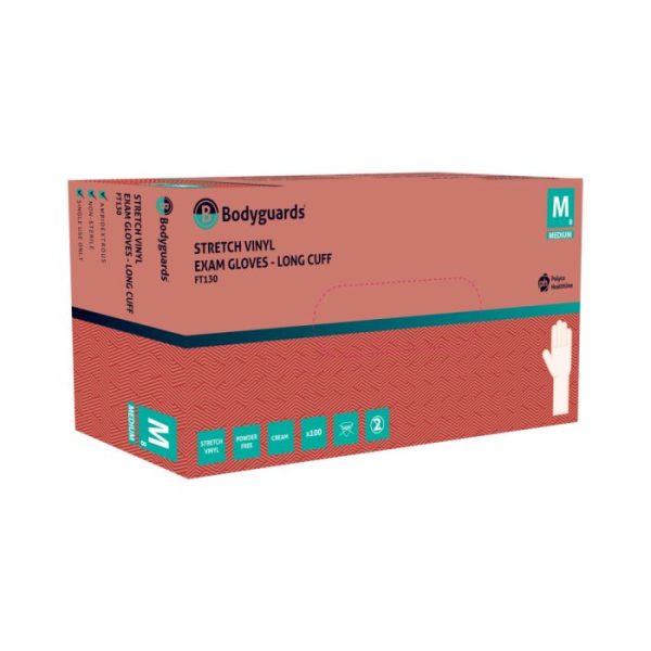 Bodyguards Finity PF30™ Cream Stretch Synthetic Powder Free Exam Gloves are synthetic vinyl gloves designed for an excellent fit that feels like a second skin. These medical grade gloves feature an extended 30cm cuff, providing added protection and ensuring a secure fit around the wrist.