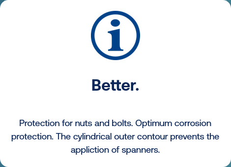 The GPN 1000 hexagonal caps protect bolts and nuts and offer a high level of corrosion protection. The cylindrical outer contour prevents the use of an open-end wrench. The thick-walled design ensures higher demands.