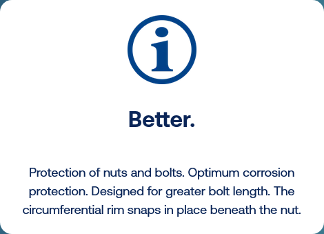The GPN 1010 snap-on caps protect bolts and nuts and offer a high level of corrosion protection. The tall design is suitable for higher bolt lengths. The circumferential clamping rim enables the snap-on caps to snap into place below the nut.