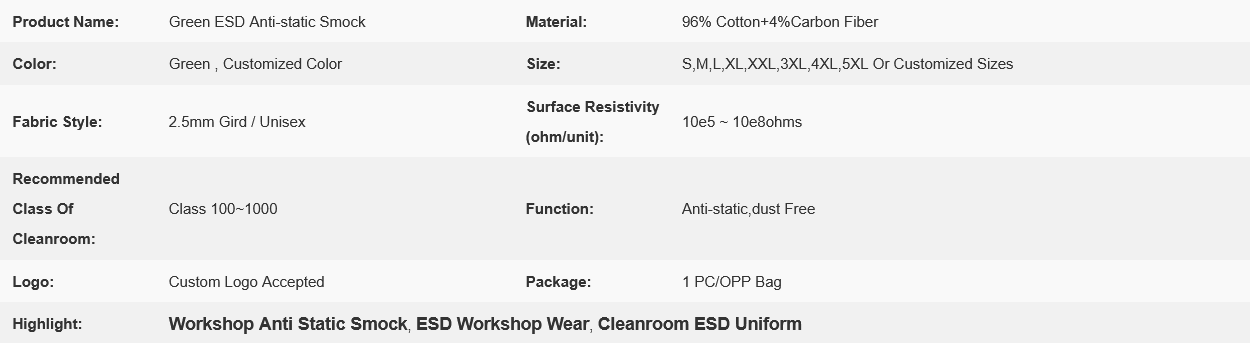 | Surface Resistance: | The fabric used in the smock has a surface resistance ranging from 10e6 to 10e9 Ω, providing reliable ESD protection and grounding capabilities. |