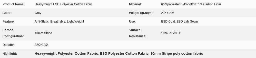 Grey 10mm Stripe Heavyweight ESD Polyester Cotton Fabric with composition 65% polyester 34 %cotton +1% Carbon Fiber