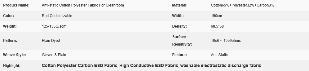 Cotton Polyester Carbon Washable Red Various Color High Conductive ESD Anti-static Cotton Fabric for Cleanroom