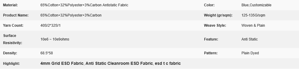 Customized Anti-static Fabric Cleanroom Polyester Cotton Blue Woven 4mm Grid Antistatic ESD T/C Fabric